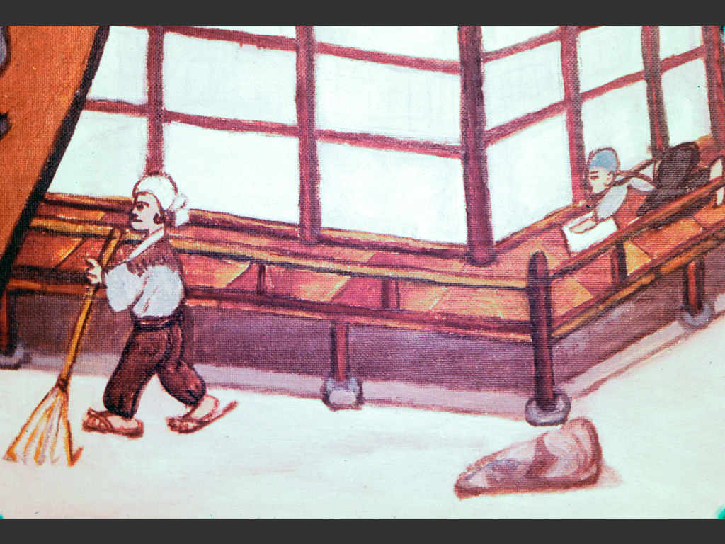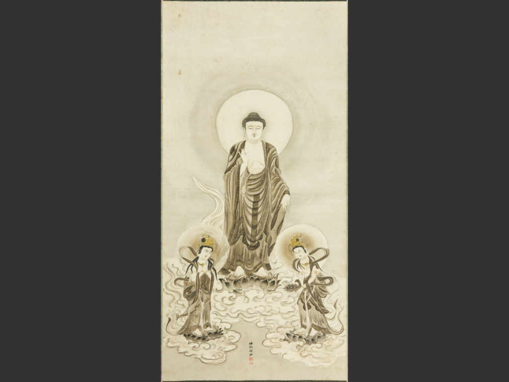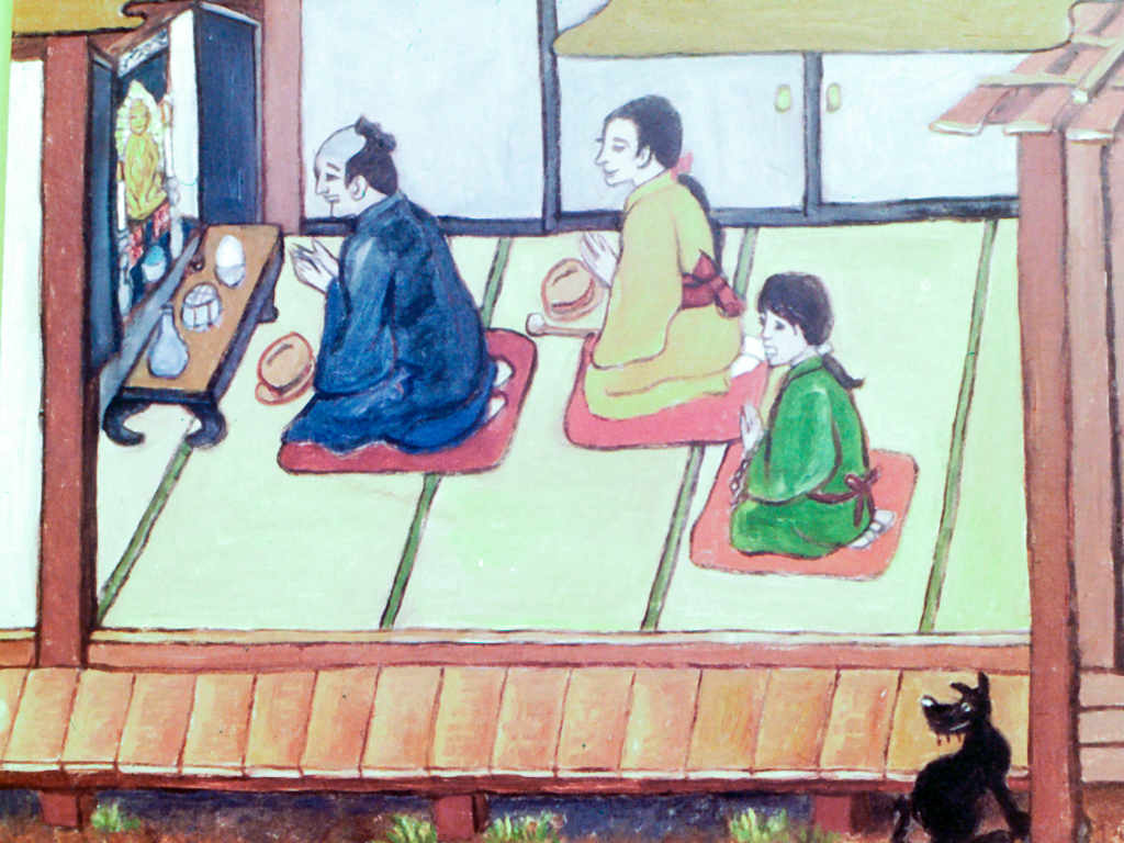 農事に励み、学問を好み、仏に思いをよせる啓之助は12歳の時、家の杉林の前で、念仏を称えながら、晴れ渡った西の空に、弥陀三尊(阿弥陀仏、観音菩薩、勢至菩薩)を想像していました。その麗しいお姿を前にして、「今は想像の仏さまだが、いつか真実の仏さまにお目にかりたい」と念願するのでした。