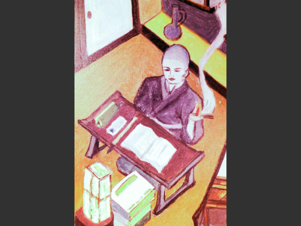 明治12(1879)年、21歳にして、両親に懇願の末、出家の素懐を遂げ「弁栄」という名前を授かりました。千葉県松戸市の名刹、浄土宗東漸寺の大谷大康(たいこう)上人に師事し、毎夜熟睡3時間の他は寺の法務や雑務、学問に忙しく、また昼も夜も常に念仏を貫きながら過ごしました。この頃、手のひらに油を入れ、これに浸した灯心に火を灯し、それを仏さまに供養するなどして睡魔を払い、「弁栄は寝ないのだろうか」との噂の立つほど日々精進されたのでした。