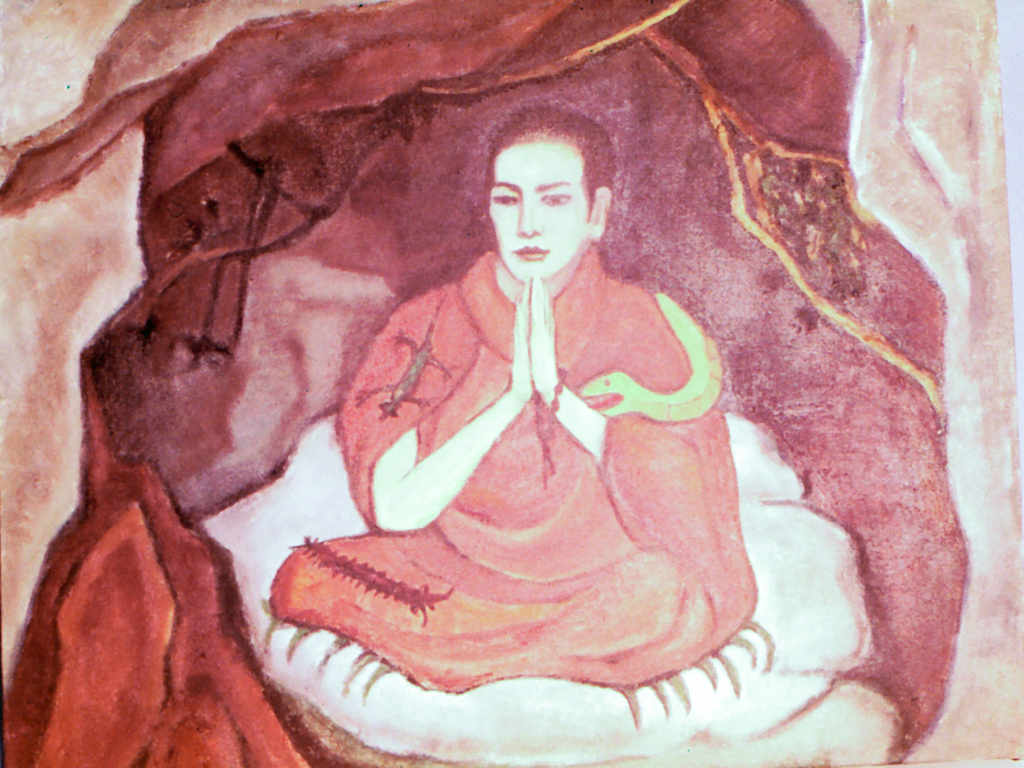 机上の仏教のみではなく、実際に歩む仏道を邁進していた弁栄上人は「ただ理窟ばかりこねまわしていたのではだめだ。農業でも理窟だけでは一粒の米も獲ることはできない。自己の人格に結ぶ果も、念仏三昧の実行の中に育まれていくものだ」との思いが高まり、明治15(1882)年、筑波山に2ヶ月籠もり、昼は洞窟の中で念仏し、夜は巌の上で礼拝の日々を過ごされました。猿やヘビ、ムカデなどが親しみ近づくほど、自然の中に融け入り、やがて安らかで静寂なる心境、仏さまや浄土の様子が現前の事実となって現れる三昧発得という深い深い境地に達せられました。その時の円満な心境を、