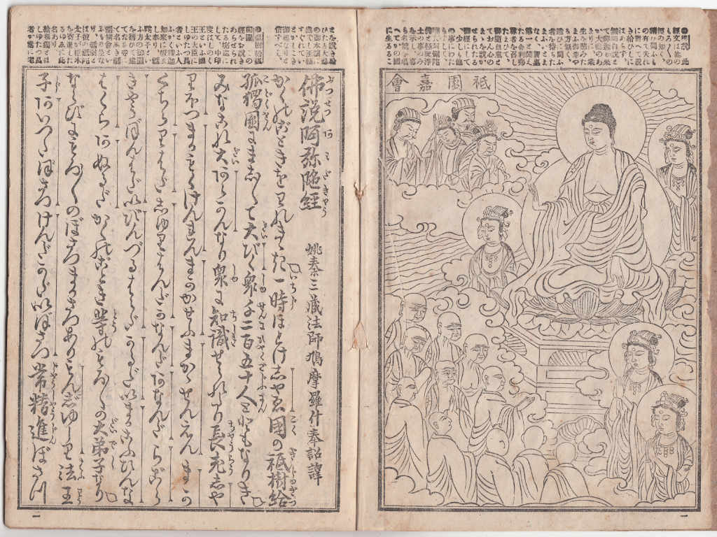 弁栄上人は人々を光明中へと誘引する為、あらゆる手だてを用いました。例えば、ご自身が作詞なされた仏教聖歌に、キリスト教の賛美歌の節を拝借し、アコーディオンやオルガンを用いて、子供達と歌いながらその情操を育み、また極楽浄土の様子を説く『阿弥陀経』を子供から大人まで親しむことができるよう絵にてして出版され、それは27万部にもおよびました。